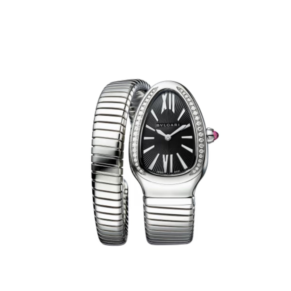 Serpenti Tubogas single spiral watch with stainless steel case and bracelet, bezel set with brilliant-cut diamonds and black dial with guilloché soleil treatment. Water-resistant up to 30 metres.